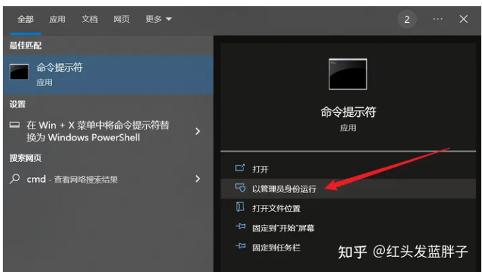 点击左下角开始菜单--输入【cmd】--出现黑板一块:命令提示符,点击【以管理员身份运行】