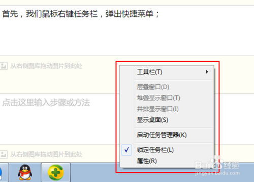 首先,我们鼠标右键任务栏,弹出快捷菜单;