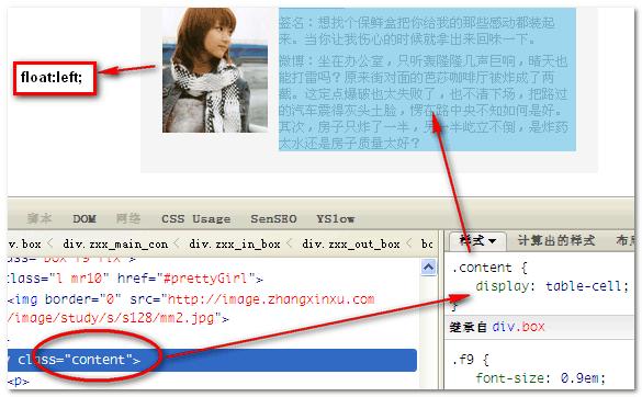 本例中,左侧为头像,右侧内容自适应。其中头像部分使用了float属性,左浮动,IE8+以及Firefox、Chrome、Opera等现代浏览器右侧使用了display:table-cell属性,结果就自适应了,很简单的代码,很神奇的效果。