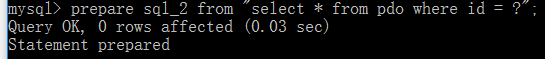 1 | prepare sql_2 from "select * from pdo where id = ?"; |