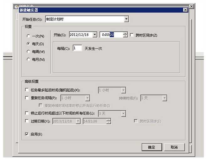 选择“触发器”选项,点击“新建”,创建任务执行时间,“重复任务间隔”这个选择后,后面有时间选择,是每小时,还是每分,可自己选择后再修改时间,再确定。
