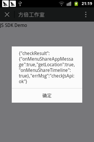 wx.checkJsApi({ jsApiList: [ 'getLocation', 'onMenuShareTimeline', 'onMenuShareAppMessage' ], success: function (res) { alert(JSON.stringify(res)); } });