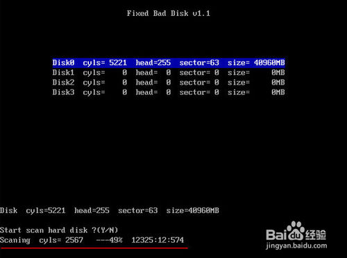 这时在界面下方会出现“Start scan hard disk?(Y/N)”,从键盘上输入“Y”如下图所示: