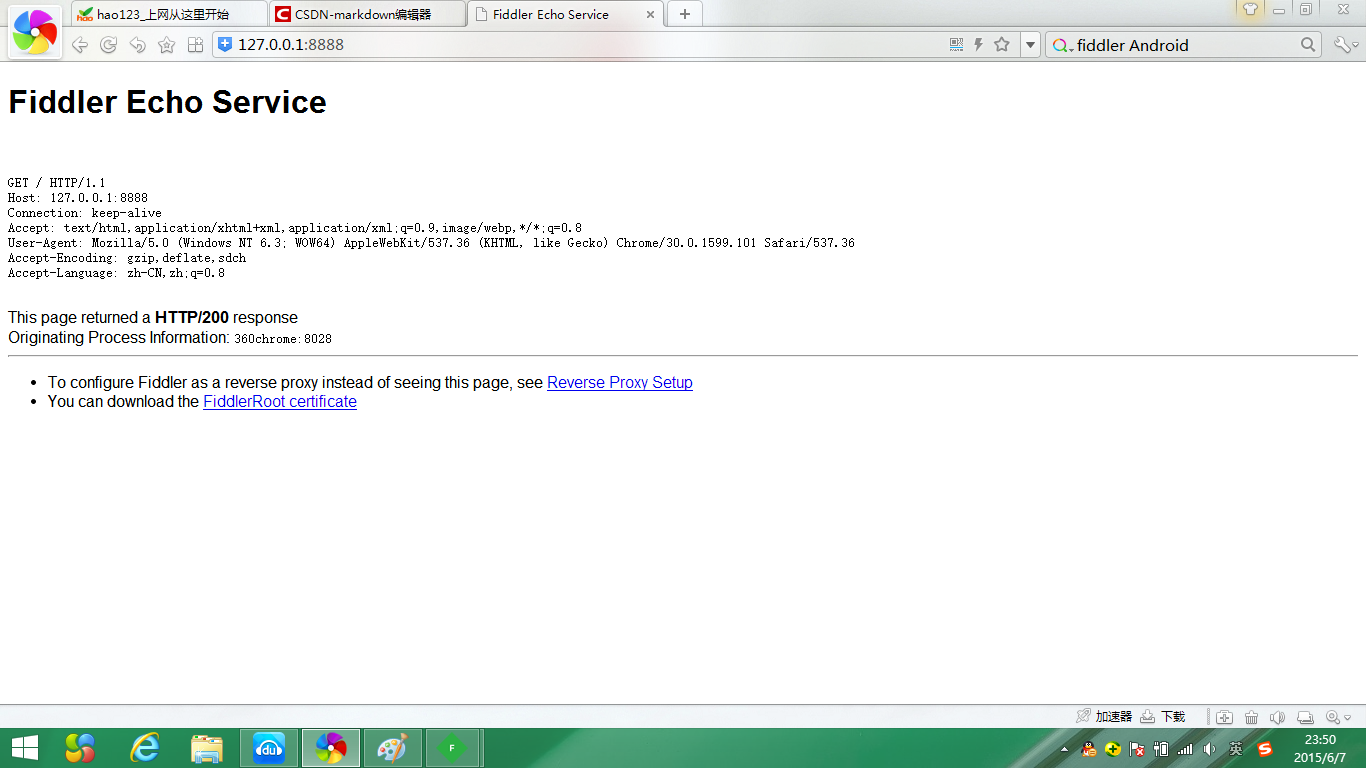 可以看到fiddler的默认端口是8888,我们可以现在浏览器上输入”http://127.0.0.1:8888”