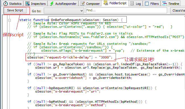 在onBeforeRequest方法中加入这样一段代码”oSession[“request-trickle-delay”] = “3000”;”,那么如果需要在服务端响应之间做延迟只需要将”oSession[“request-trickle-delay”] = “3000”;”中的request替换成response即可。