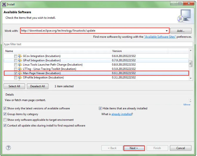 找到man-page viewer并进行安装直至完成,最后重启Eclipse。如下图所示: