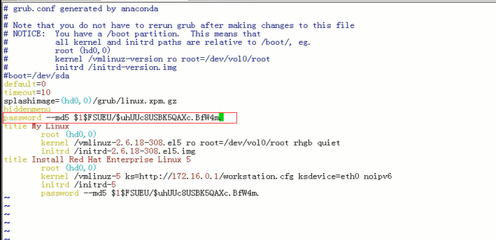 但是 /boot/grub/grub.conf 随便任何人都可以看 可以使用加密格式的 (记住是 password 不是 passwd)