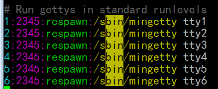 1:2345:respawn:/sbin/mingetty tty1 (只要/sbin/mingetty tty1 命令停了,就重启一次)(进程终止,再启动)(respawn是用来控制终端的)