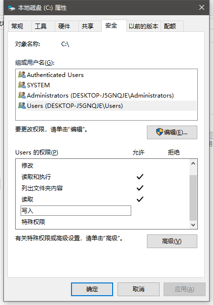 1. 设定 C: 的 NTFS 文件夹权限为 Users 或 Domain Users 具有写入权限;