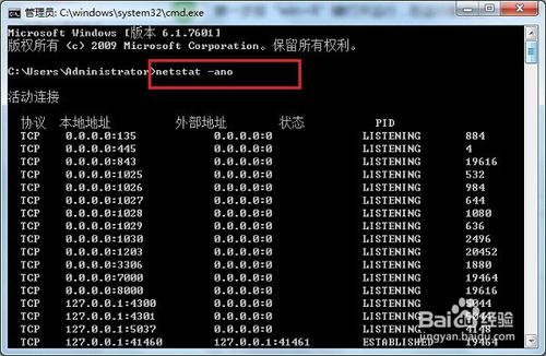 第二步在命令提示符中输入“netstat -ano”,按回车键,查看端口使用情况,如下图所示: