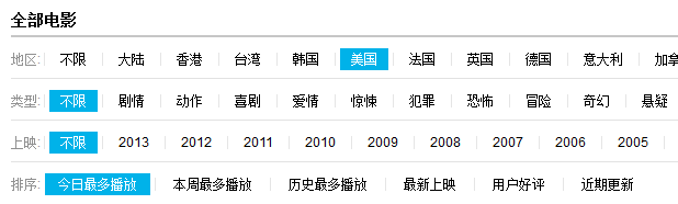 在开始介绍如何实现这样的功能前,我们先统一一下对需求的认识。并且在这里希望大家认识到随着网站信息量的增大,内容标识维度的增加,不只是电影网站、网上商城,多条件过滤可以应用的范围是非常广泛的,旅行、美食、创业、图书管理、同城交友哪里都可以它的身影,希望大家开动脑筋、发散思维 :D