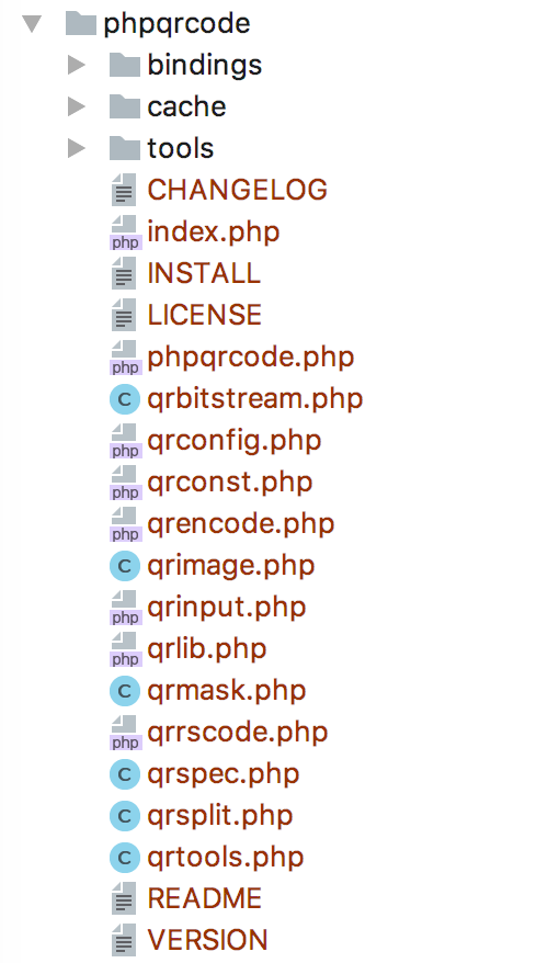 下载下来的类文件是一个压缩包,里边包含很多文件和演示程序,我们只需要里边的phpqrcode.php这一个文件就可以生成二维码了。它是一个多个类的集合文件,我们需要用到里边的QRcode类(第2963行)的png()方法(第3090行):