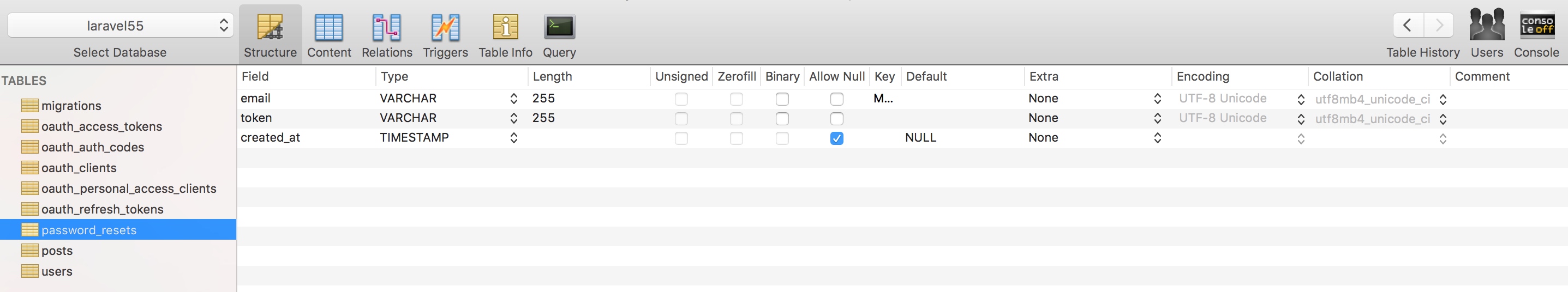 接下来,用来存储密码重置令牌的表必须被创建,Laravel 已经自带了这张表的迁移,就存放在 database/migrations 目录。所以,你所要做的仅仅是运行迁移: