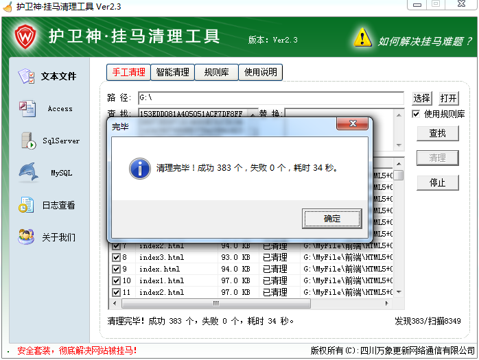 良心工具啊,免费不说,清理速度真快,就是需要手工清理,多清几次就干净了。直接百度搜 护卫神挂马清理工具 就可以找到,好用免费速度快。