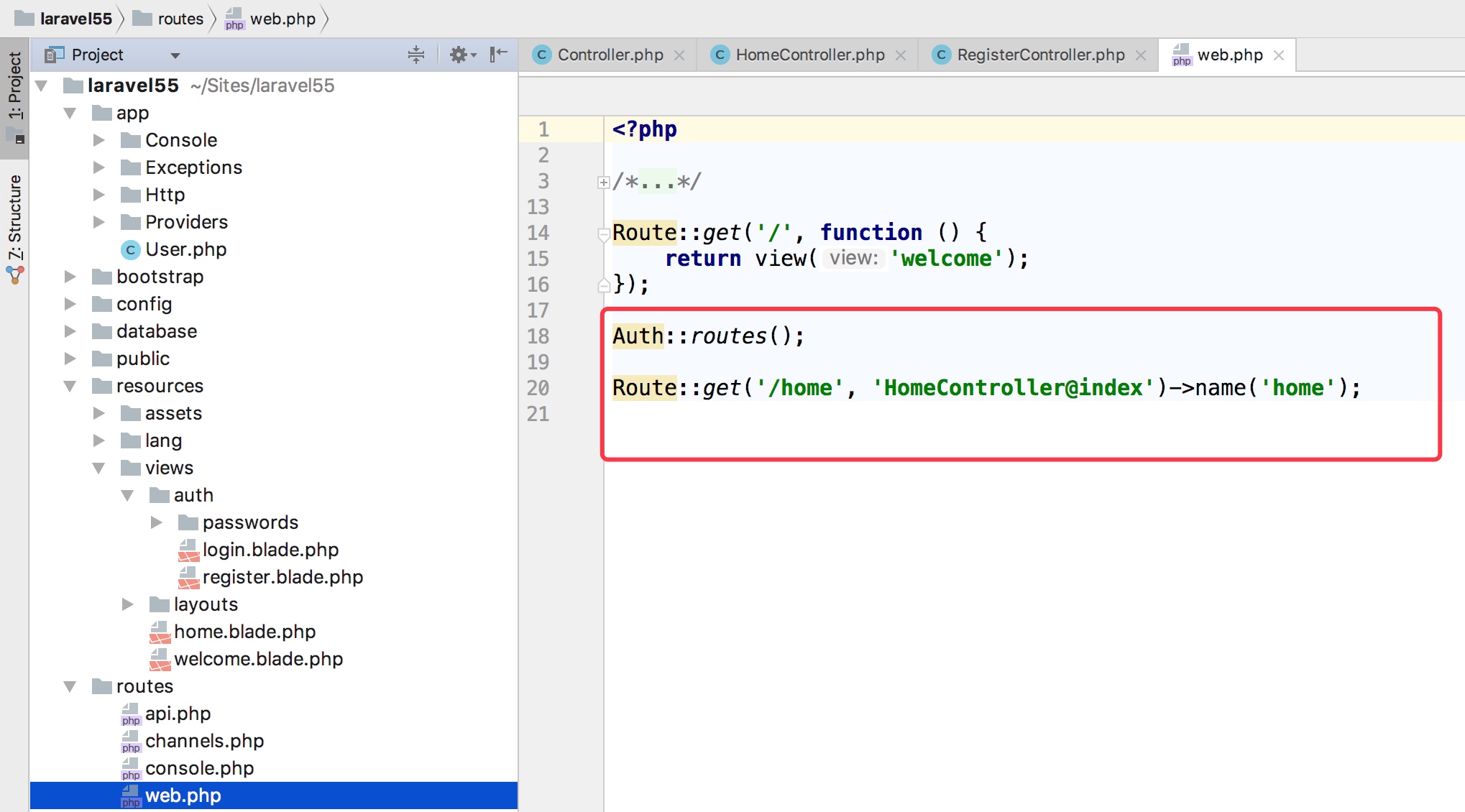 新安装的应用运行该命令会生成布局、注册和登录视图,以及所有的认证路由,同时生成 HomeController 用于处理应用的登录请求。 打开 routes/web.php 路由文件会发现新增了两行:  登录注册相关路由都定义在上面 Auth::routes() 方法内。