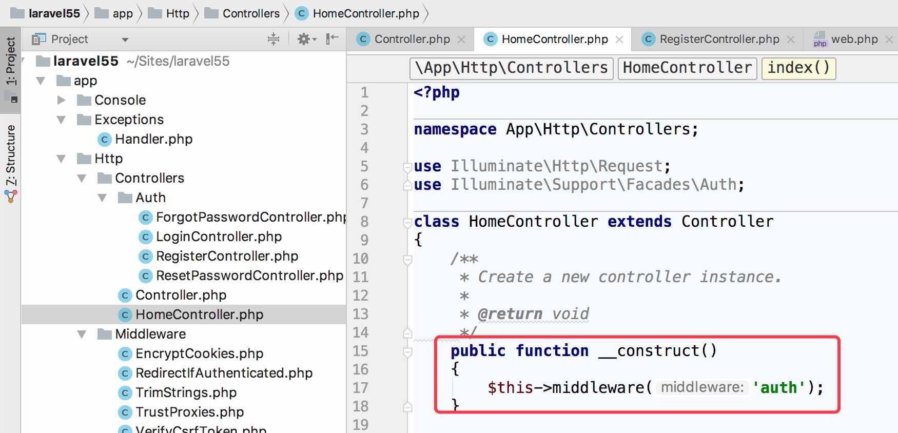当然,如果你也可以在控制器的构造方法中调用 middleware 方法而不是在路由器中直接定义实现同样的功能: