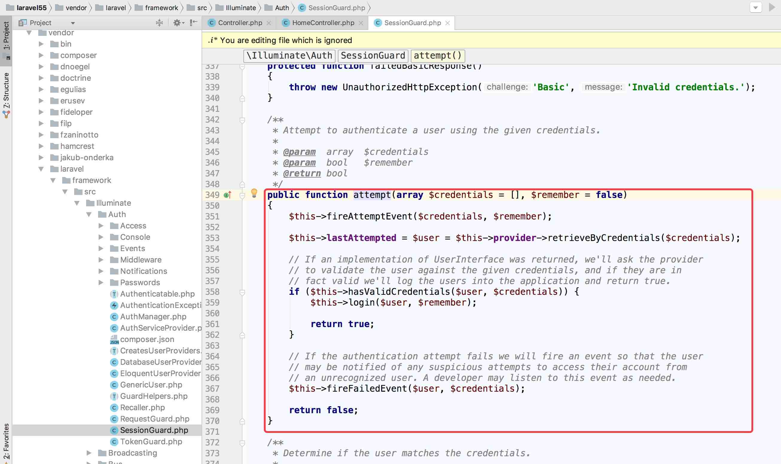 attempt 方法接收键/值对作为第一个参数,数组中的值被用于从数据表中查找对应用户。在上面的例子中,将会通过 email 的值作为查询条件去数据库获取对应用户,如果用户被找到,经哈希运算后存储在数据库中的密码将会和传递过来的经哈希运算处理的密码值进行比较。如果两个经哈希运算的密码相匹配,那么将会为这个用户设置一个认证 Session,标识该用户登录成功。感兴趣的同学可以去看下底层源码实现逻辑:  如果认证成功的话 attempt 方法将会返回 true。否则,返回 false。 重定向器上的 intended 方法将用户重定向到登录之前用户想要访问的 URL,在目标 URL 无效的情况下回退 URI 将会传递给该方法。 指定额外条件 如果需要的话,除了用户邮件和密码之外还可以在认证查询时添加额外的条件,例如,我们可以验证被标记为有效的用户: