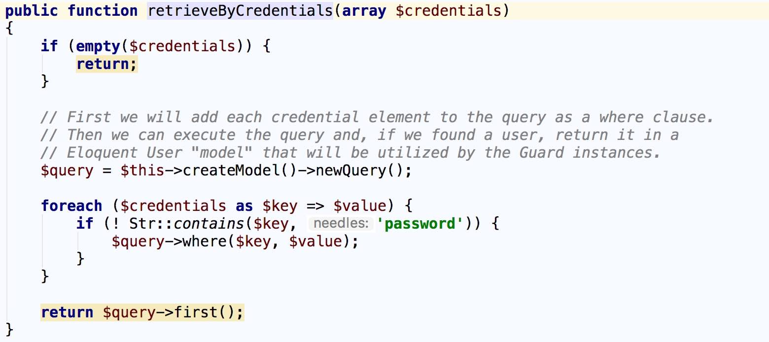 既然我们已经探索了 UserProvider 上的每一个方法,接下来让我们看看 Authenticatable。记住,提供者需要从 retrieveById 和 retrieveByCredentials 方法中返回接口实现: