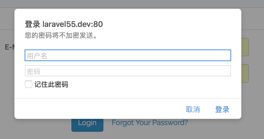 中间件加到路由中后,当在浏览器中访问该路由时,会自动提示需要认证信息,默认情况下,auth.basic 中间件使用用户记录上的 email 字段作为“用户名”:  这种基本认证除了没有独立的登录表单视图之外底层实现逻辑和正常的登录认证没有区别。 FastCGI上的注意点 如果你使用 PHP FastCGI,HTTP 基本认证将不能正常工作,需要在 .htaccess 文件加入如下内容: