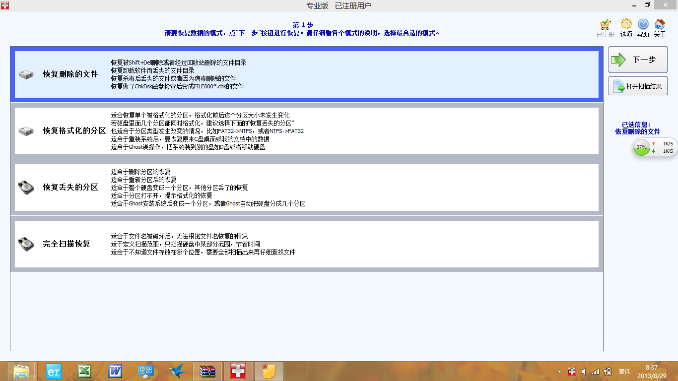 第一步:选择要恢复数据的模式,点“下一步”按钮进行恢复