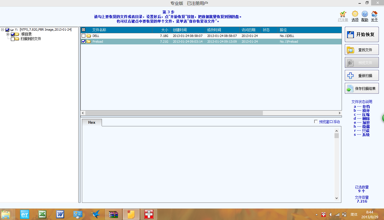 第三步:勾上要恢复的文件或者目录,设置好后,点“开始恢复”按钮,把数据批量恢复到别的盘,也可以右键点中要恢复的单个文件,菜单选“保存恢复该文件”