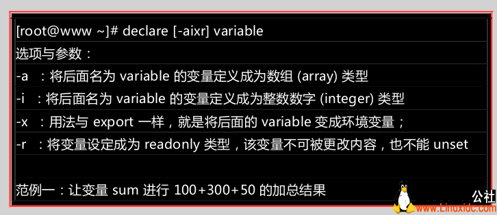declare [+/-][rxi][变量名称=设置值] 或 declare -f