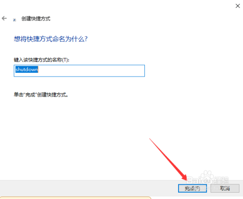 在框内输入“shutdown –s –t 5”,也就是五秒关机,然后点击【下一步】,再点击【完成】。