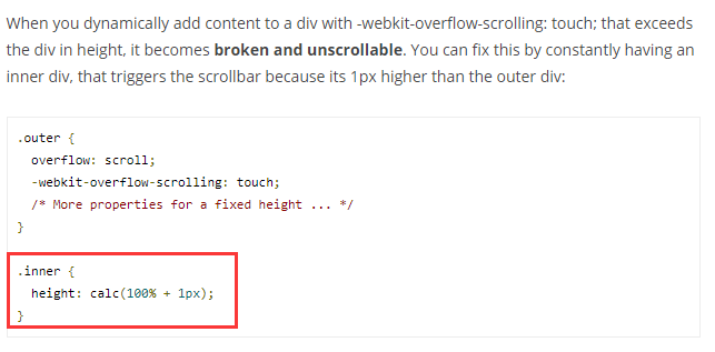 方法就是在webkit-overflow-scrolling:touch属性的下一层子元素上,将height加1%或1px。从而主动触发scrollbar。