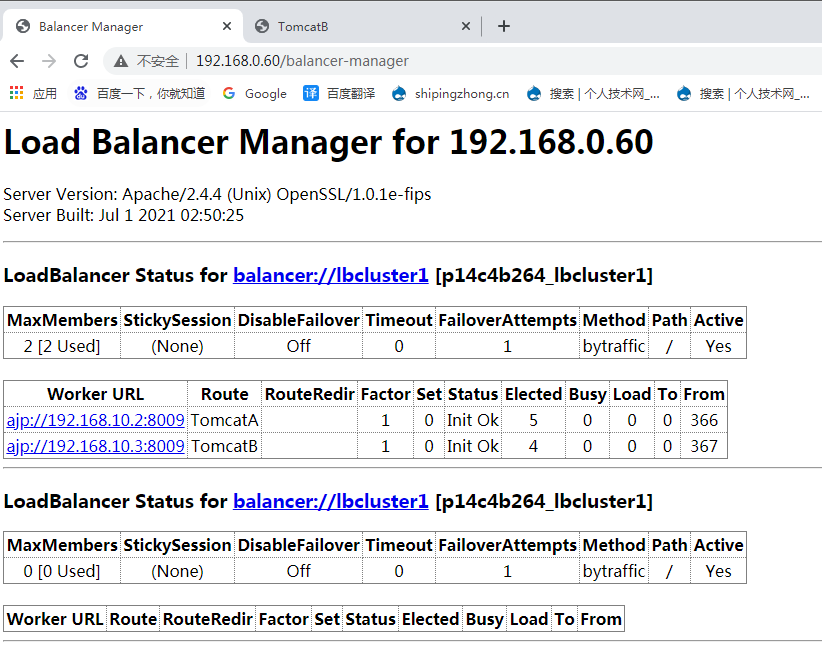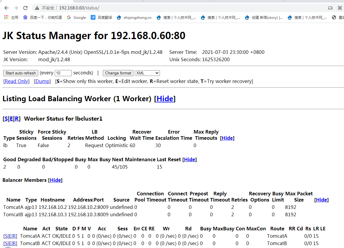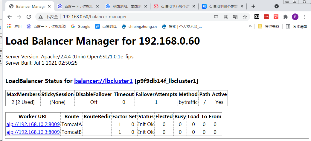 http://192.168.0.60/balancer-manager #如下图有点慢,为什么tomcat2 还是Init Ok? 这个页面显示不了,,,是不是反应有点慢