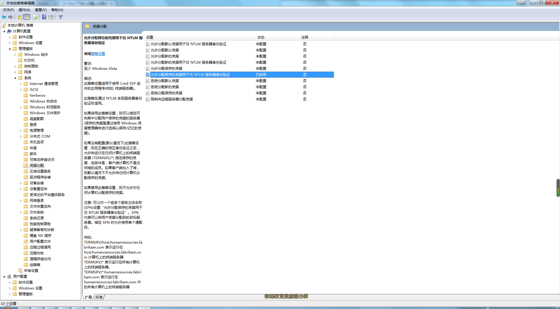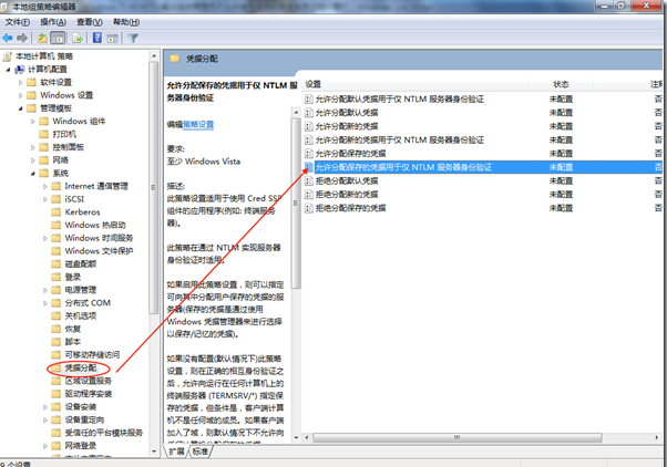 在本地计算机策略-计算机配置-管理模板-系统-凭据分配。找到允许分配保存的凭据用于仅 NTLM 服务器身份验证。