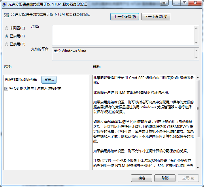 启用“允许分配保存的凭据用于仅 NTLM 服务器身份验证”,并点击“将服务器添加到列表:显示”,在服务器列表中添加允许保存凭据的服务器名称和类型,如 dc.contoso.com 上的终端服务器,即“TERMSRV/dc.contoso.com”。当然也可以输入“TERMSRV/*”允许保存所有计算机的远程终端凭据。