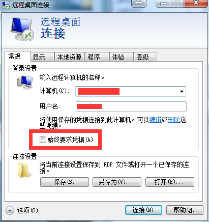 6、最后应用用保存,打开远程桌面连接程序,取消勾选““始终要求凭据”并连接,只要输入过一次密码后,下次登录就不需要输入了