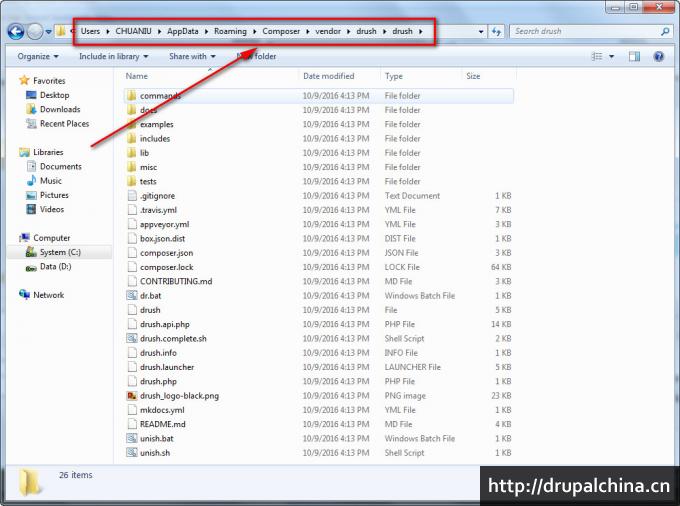 路径在这里,Windows7 下路径格式是这样:C:/Users/[user name]/AppData/Roaming/Composer/vendor/drush/drush,注意把“[user name]”替换为你电脑的用户名哦!