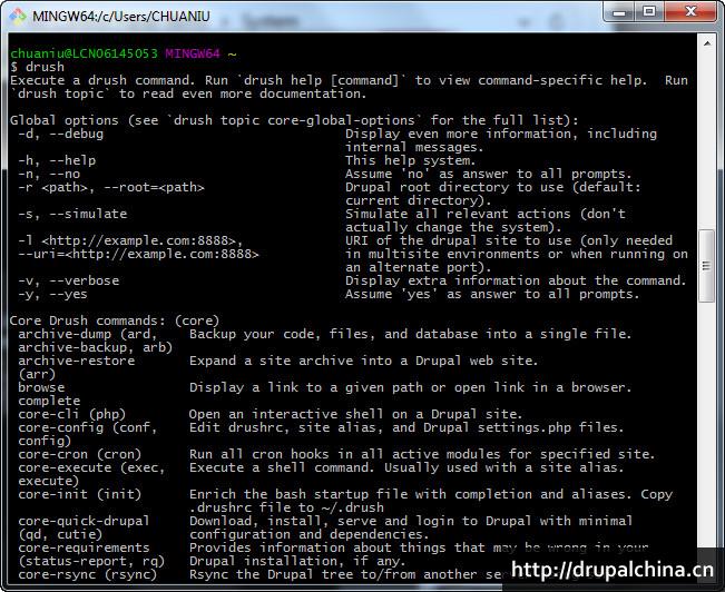 环境变量添加了之后,来试试drush命令,键入“drush”,看看出现点啥: