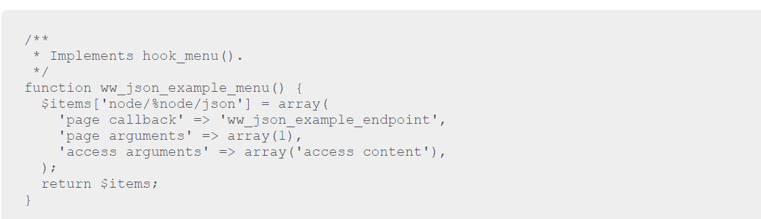 The last item I want to demonstrate is how to create a JSON endpoint for content on a Drupal site. For example, if you navigate to example.com/node/1/json the website will output a JSON version of the content. This will show you how to output a full JSON page using the drupal_json_output() function.