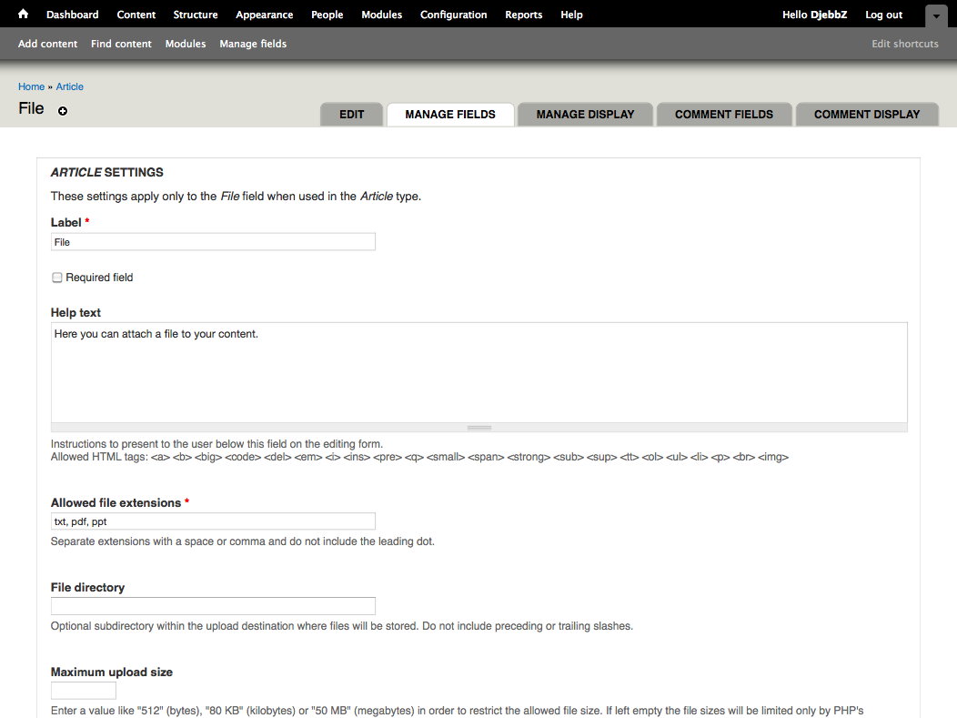 您可以在配置内容类型时为文件字段添加验证选项。您必须列出最终用户需要能够上传的所有文件扩展名。上传文件的可选文件目录是文件系统管理页面(管理 > 配置 > 媒体:文件系统)中定义的文件系统路径的子目录。您可以为每个上传的文件指定最大文件大小。