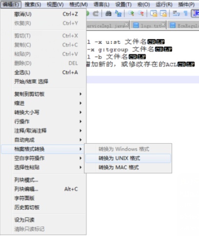 2)设置行尾符格式:编辑 -> 档案格式转换 ->(可选 Windows、Unix 和 Mac中的一种),若是是英文版的 Notepad++,则应该是 Edit -> EOL Conversion -> Windows Format、Unix/OSX Format、Old Mac Format。