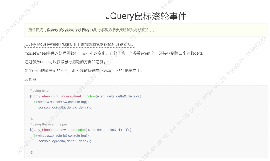 1 2 3 4 5 6 7 8 9 | // 方式1:using on$('#my_elem').on('mousewheel', function(event,delta) {