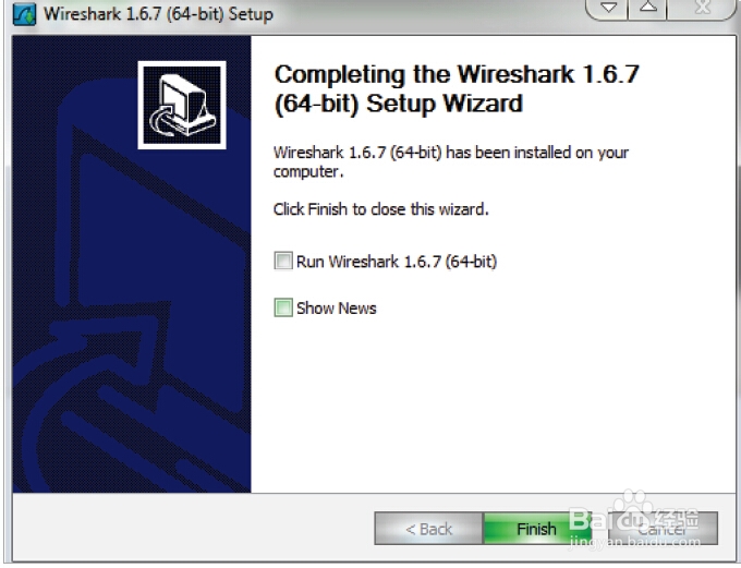 到了如图2-1-11所示的界面后说名wireshark已经安装成功了,点击“Finish”后在桌面我们可以看到wireshark的快捷方式;