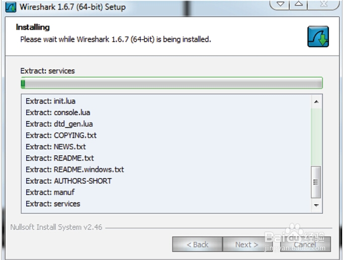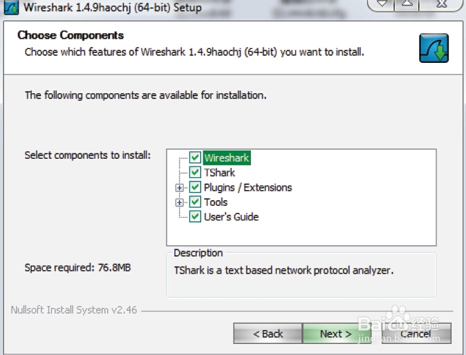 通常使用到的有:wireshark主程序(图形界面)、TSshark(基于命令行的)、plugins/extensions(wireshark以及TSshark的一些扩展插件)等...在此我们选择安装全部组件程序后点击“Next”进入到下一步安装;