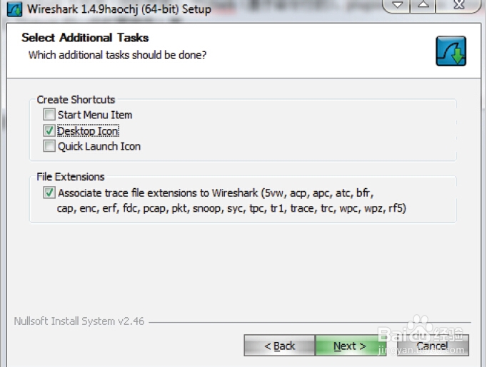 如图2-1-3所示在此界面wireshark安装程序会询问我们是否要在开始菜单(Start Menu Item)、桌面快捷方式(Desktop Icon)、快速启动栏(Quick Launch Icon)以及是否关联所列出的后缀名文件。在此我们选择建立桌面快捷方式并且关联到列出后缀名文件后点击“Next”进入到下一步安装;