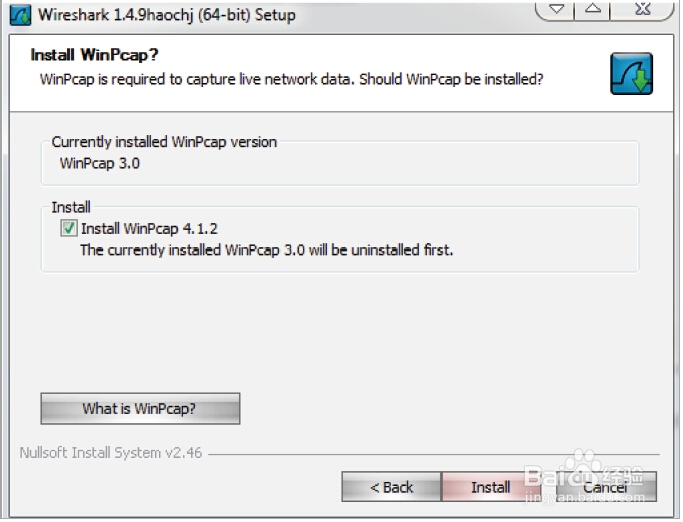 图2-1-5所示,wireshark安装程序询问我们是否安装依赖软件WinPcap 3.0(该软件主要用于捕获网络底层数据包),假如您的电脑上已经安装了该软件,那么我们可以取消掉该软甲的安装。在此处由于我们没有安装过该软件我们勾选该复选框后点击“Install”执行安装;