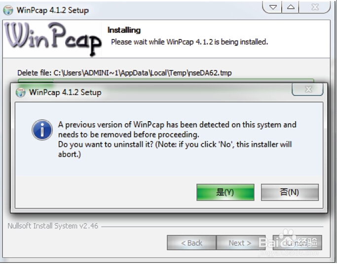假如出现图2-1-10的提示,那么就是您的电脑已经安装了该类软件,WinPcap询问我们是否卸载以前所安装的WinPcap。在此我们选择“是”后WinPcap开始自动安装;