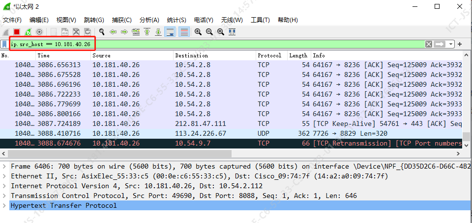 ip.src_host == 10.181.40.26 #本机上的某个ip (10.181.40.26) 向外发送的数据包都筛选出来了