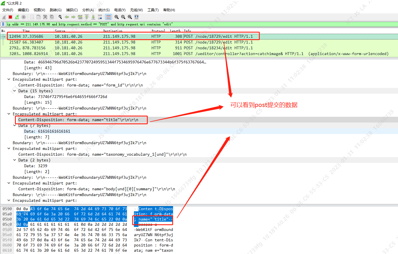 http.request.uri contains ".gif$” 注意区别:http.request.uri contains ".gif$” 与此不同,contains是包含字符串”.gif$”(5个字节)。匹配过滤HTTP的请求URI中含有”.gif$”字符串的http请求数据包(这里$是字符,不是结尾符)