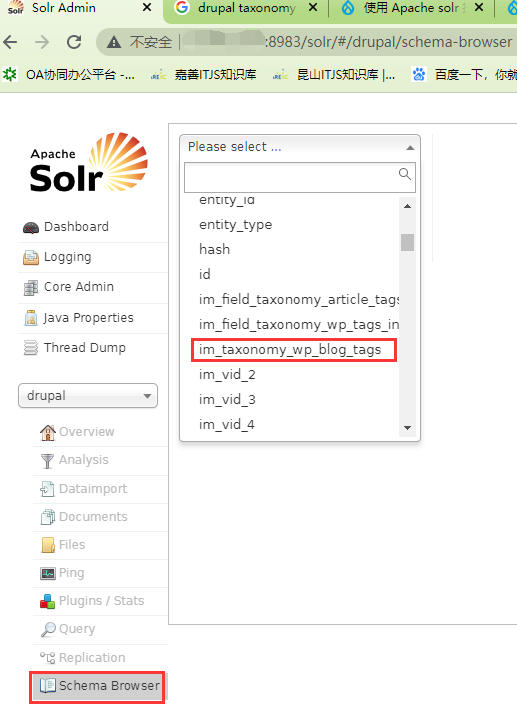 7) 可以看到了 :8983/solr/#/drupal/schema-browser