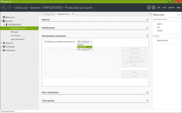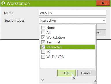 UserLock可以为受保护的帐户(用户,组织或单位)定义机器列表。您可以限制用户仅从特定机器连接以打开工作站或终端会话。