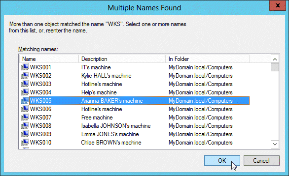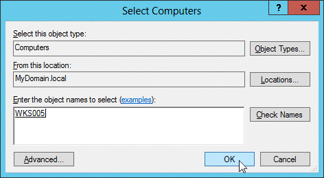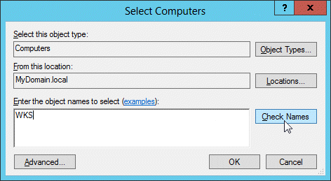 四、或者您可以单击“添加计算机”,其中将显示“Active Directory”对话框以选择目标计算机。键入计算机名称的开头,然后单击“检查名称”,或者如果您愿意,启动“高级”模式。
