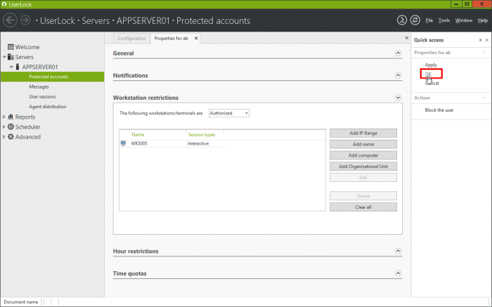 用户“ab”现在仅被授权从计算机“WKS005”打开工作站或终端会话。所有来自其他机器的连接尝试将被UserLock拒绝。