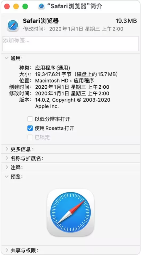 只有通用 app 的 “简介” 窗口包含“使用 Rosetta 打开”设置。这项设置可以让网页浏览器或电子邮件 app 等通用 app 使用尚未更新以支持 apple 芯片的插件、扩展和其他附加项。如果某个通用 app 无法识别您为这个 app 安装的附加项,您可以退出相应 app,选择这项设置,然后再试一次。